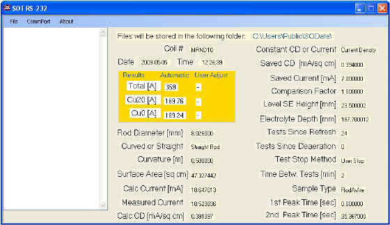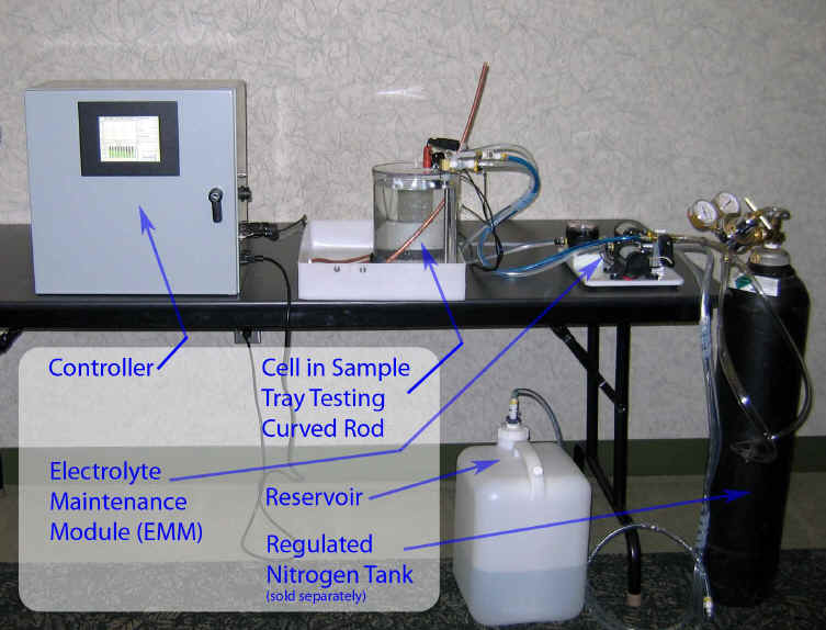 This system introduces a new feature that improves test repeatability dramatically. This is the ability to measure coiler curved rod as shown in the cell to the immediate right. Testing coiler curved rod rather than straight rod eliminates the rod straightening processes, which introduces artifacts into the surface. Furthermore over 20% more of the rod surface is tested for the same electrolyte level height. This cell is designed to accepts the traditional straightened rods as well, as shown in the far right image. |