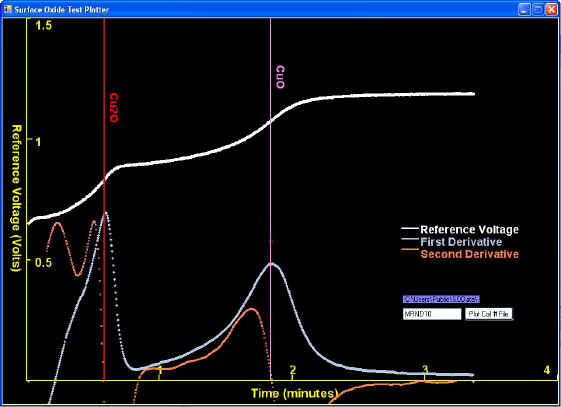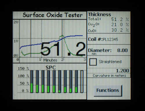 One very useful feature provided in the software is that the results can be displayed as percentages of a key grading limit instead of in Angstroms. This gives the most meaning to the results. For example, the screen below shows the results of the same test as in the screen above. However, with the screen below the user has entered in a grading limit of 400 Angstroms and thus it shows that the results of this are about 50% of the grading limit.