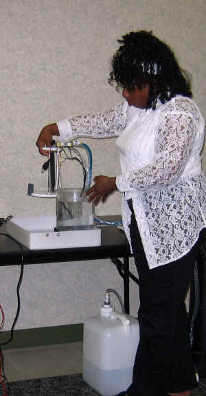 The photograph to the right illustrates one valuable feature designed into the system, namely, that the cell is very easily cleaned. The cell readily disconnects electrically and can also disconnect from the EMM through quick disconnect tube couplings. All cell components can be swiftly lifted out of the vessel. |